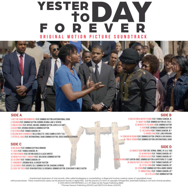 The Yesterday Today Forever experience does not end when the credits roll. It continues through a 32 track, double vinyl soundtrack that captures the emotional, spiritual, and cultural heartbeat of the film. Spanning worship, hip hop, spoken word, and cinematic instrumentals, this soundtrack mirrors the journey of the Gospel itself. From suffering to resurrection. From doubt to redemption.
